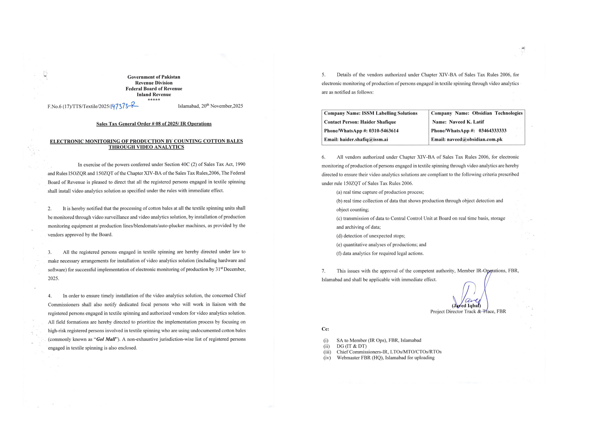 This official FBR notification mandates the electronic monitoring of production in textile spinning units through video analytics under The Sales Tax Act, 1990. It formally announces that the regulation will take effect from November 1, 2025, ensuring compliance with Rule 150ZQR of The Sales Tax Rules, 2006.
